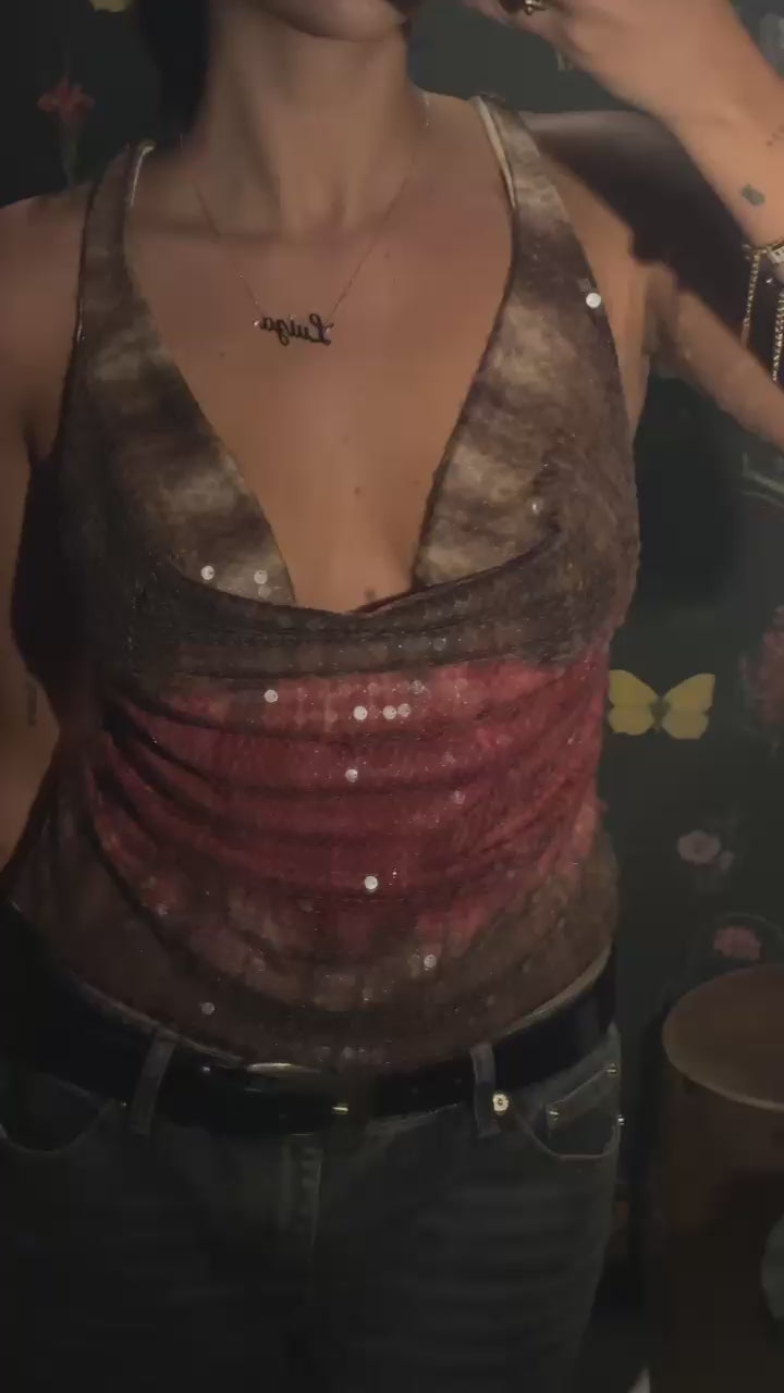 Description: mid-length blouse (up to the navel), with a dropped slip dress neckline, and the entire fabric covered in sequins, piece with double finishing and lining on the inside .