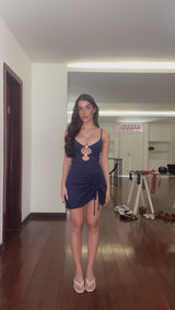 Descripción: Vestido de alças finas fixas, com busto arredondado e firme. Possui caimento acinturado com a barra solta e comprimento curto.